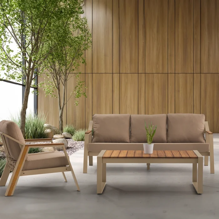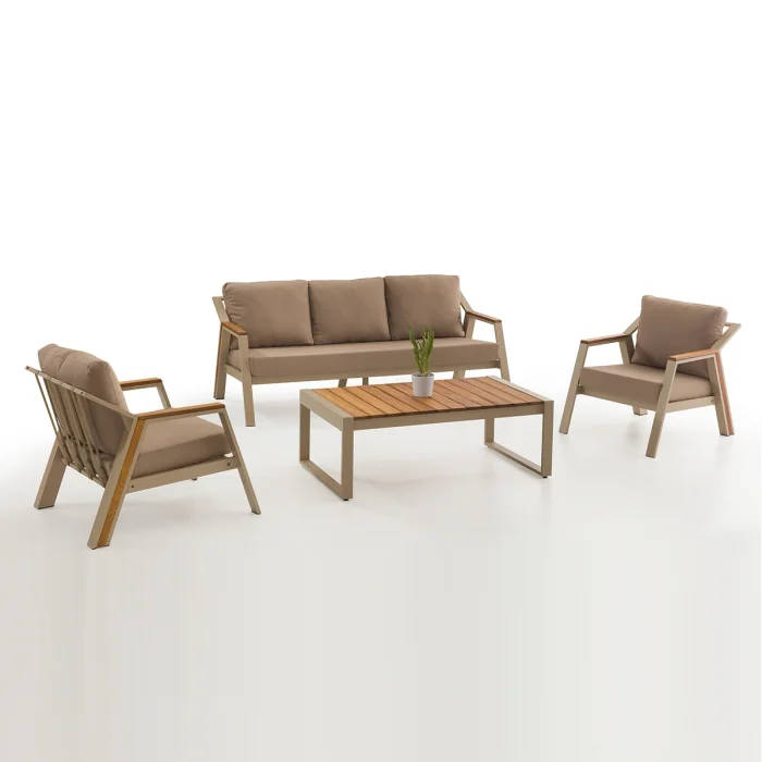 It is made of aluminum material. It is painted with powder coating suitable for outdoor use. The wooden parts are made of iroko wood. The cushions and pillows are covered with washable, water-repellent outdoor fabric. There are 4 different types of fabrics in the collection: coffee, cream, gray and anthracite.