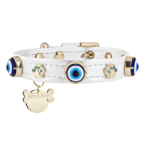 Pearlescent White is elegantly embellished with shimmering glass evil eye beads and gold-plated tiny paws on vegan-friendly glitter leather. This collar will be a unique accessory to complement your dog's style on special occasions while also providing a great option for everyday wear. You can complete your dog's look with a walking strap that includes vegan-friendly leather and glass evil eye beads in the same color.