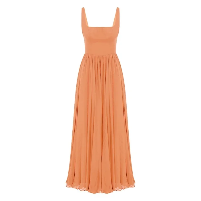 Product: Silk Square Neck Gathered Flared Midi Dress