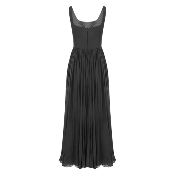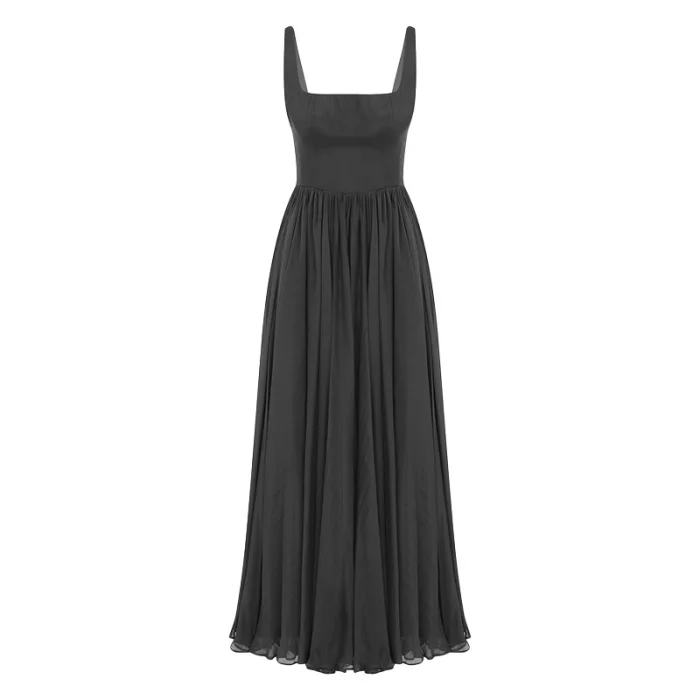 Product: Silk Square Neck, Gathered Waist, Flared Midi Evening Dress