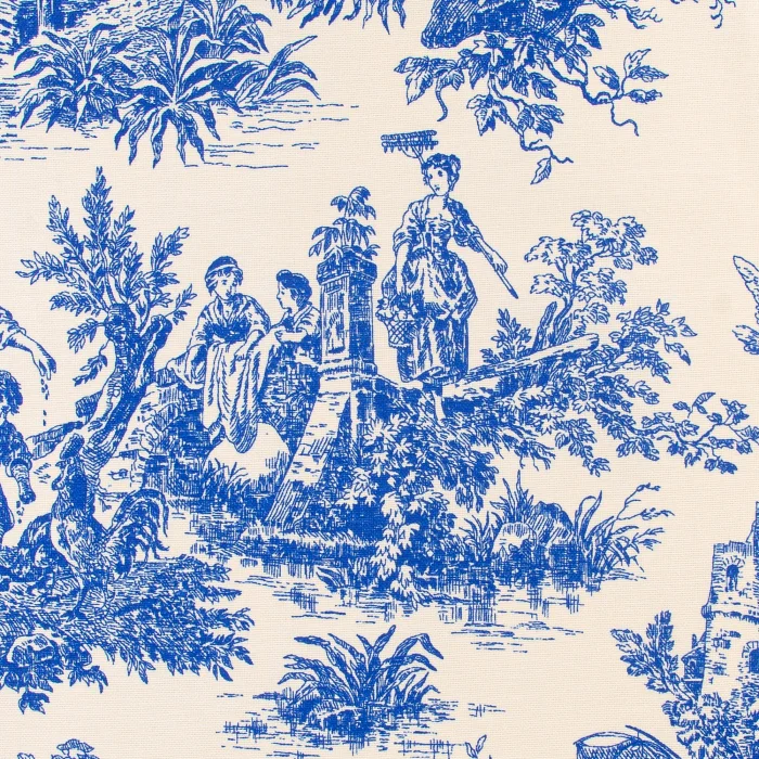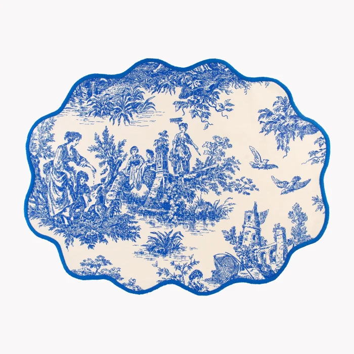 Enhance your home decor with the Neroni royal blue scalloped placemat featuring a French peasant pattern (toile de jouy). This elegant and stylish product is designed to complement any table setting.