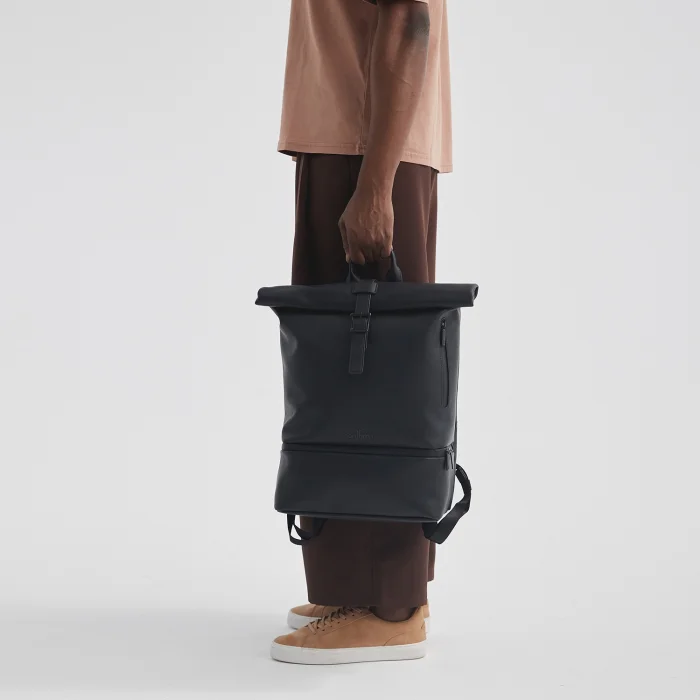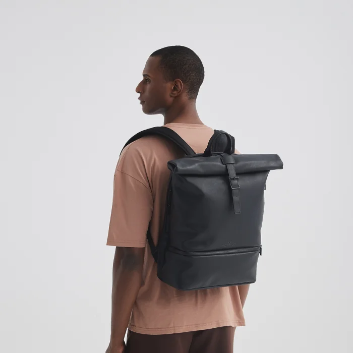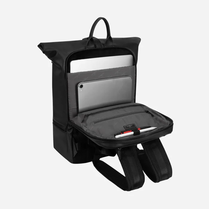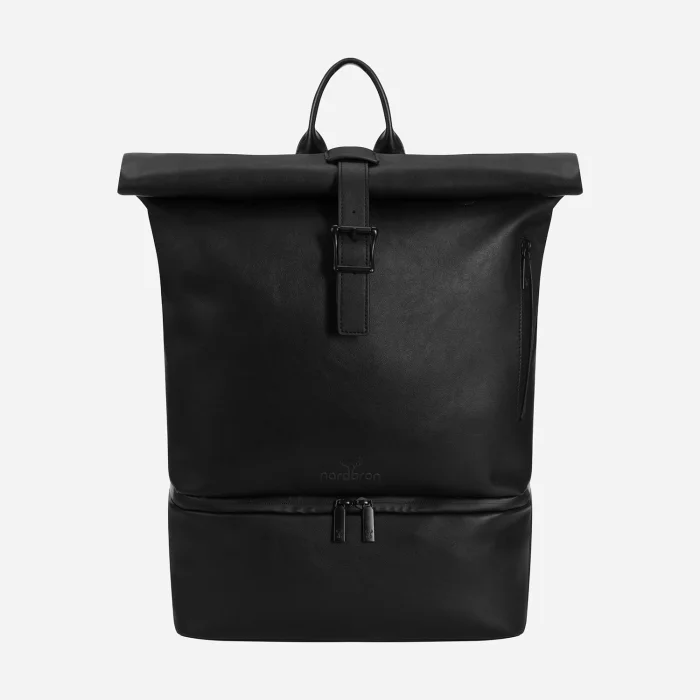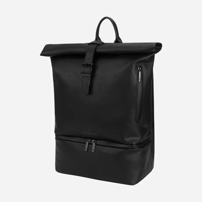 The main sections at the back and front: Front main compartment with magnet and lid Zippered bottom compartment Zippered side compartment 4 interior compartments without zippers Zippered rear main compartment; Padded laptop compartment in the inner rear (16") Zippered/non-zippered interior compartments Zippered compartments on the rear exterior Adjustable shoulder strap Nordbron Logo 100% Artificial Leather Water repellent fabric feature Width: 38 cm Height: 44 cm Inner depth: 16 cm Volume: 26L Weight: 1300 gr.