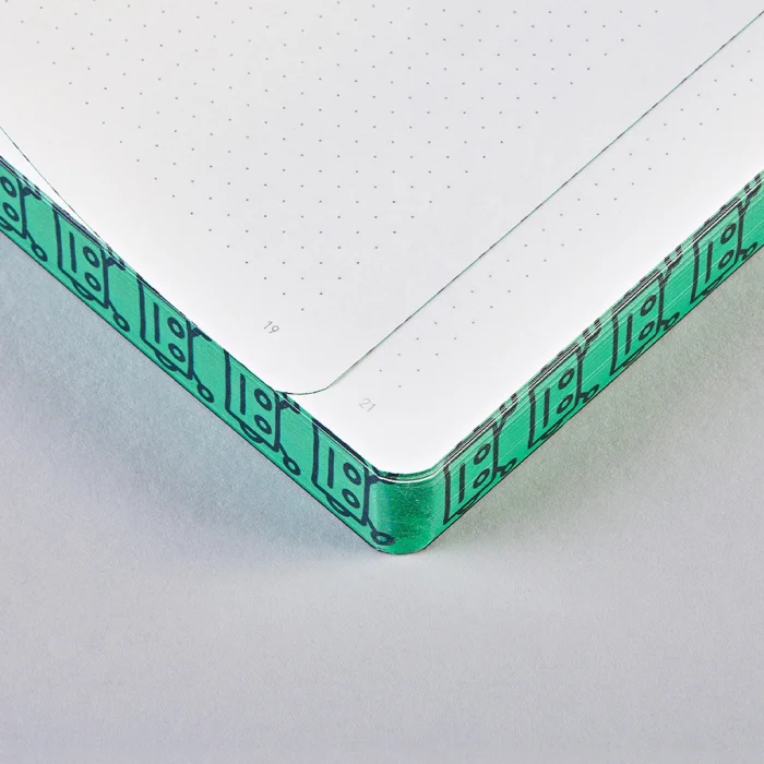 • Edge printing that complements the notebook motif and protects your notebook from dust and dirt • Thread stitching to keep the notebook straight • Recycled denim fabric • Environmentally friendly • Soft and flexible cover • High quality silk screen printing • 120 Gr high quality munken paper • 256 numbered pages • Page Style : 3.5 mm gray dots • Book weight : 580 gr • Format L: 165x220 mm • Place of Production : Germany