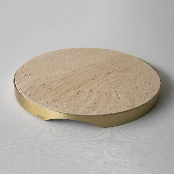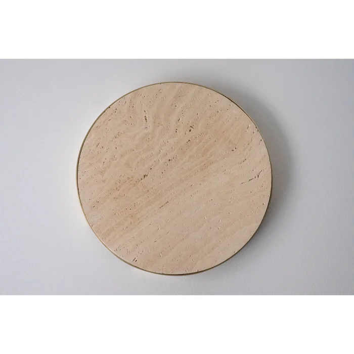 Frame: Solid BrassMaterial: White, Black, Calacatta viola, Green arebescato marble and travertine.Product Dimensions: Diameter: 30 cm Height: 2.5 cm (approx)Weight:2300 g- Colour and pattern may vary for each object reflecting the raw/unique beauty of marble, making every item one of a kind.