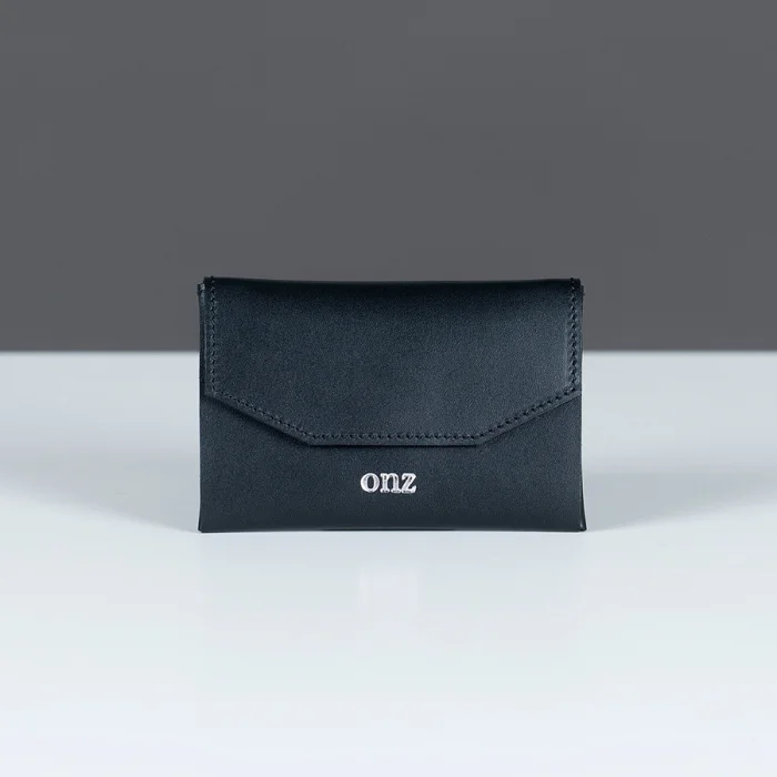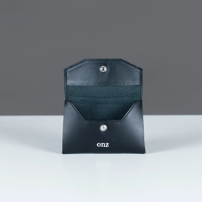 Vegetable tanned black calf leather envelope card holder with a snap-button flap closure and the silver onz logo.