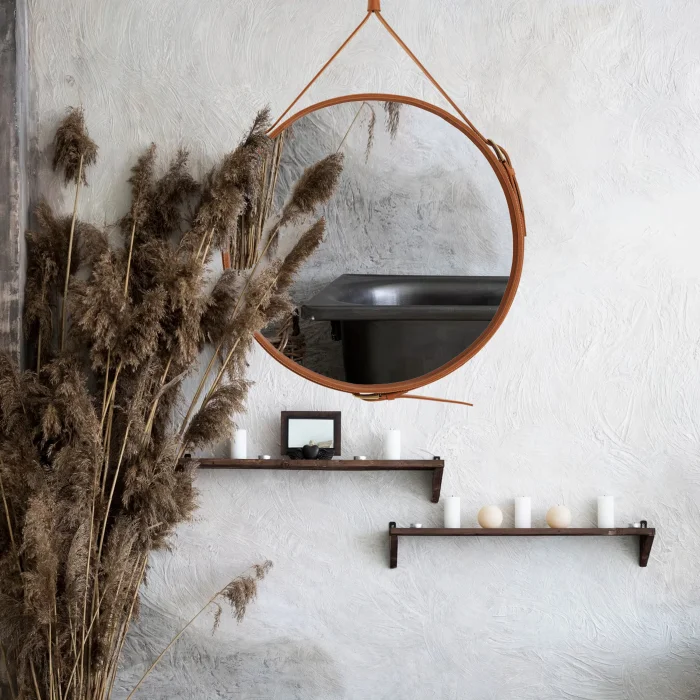 It is handmade by a single craftsman from top quality vegetable tanned leather, 3.5-4 mm thick. Hand stitched. The buckles and hanging apparatus are solid brass.