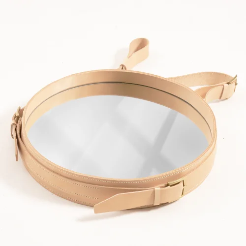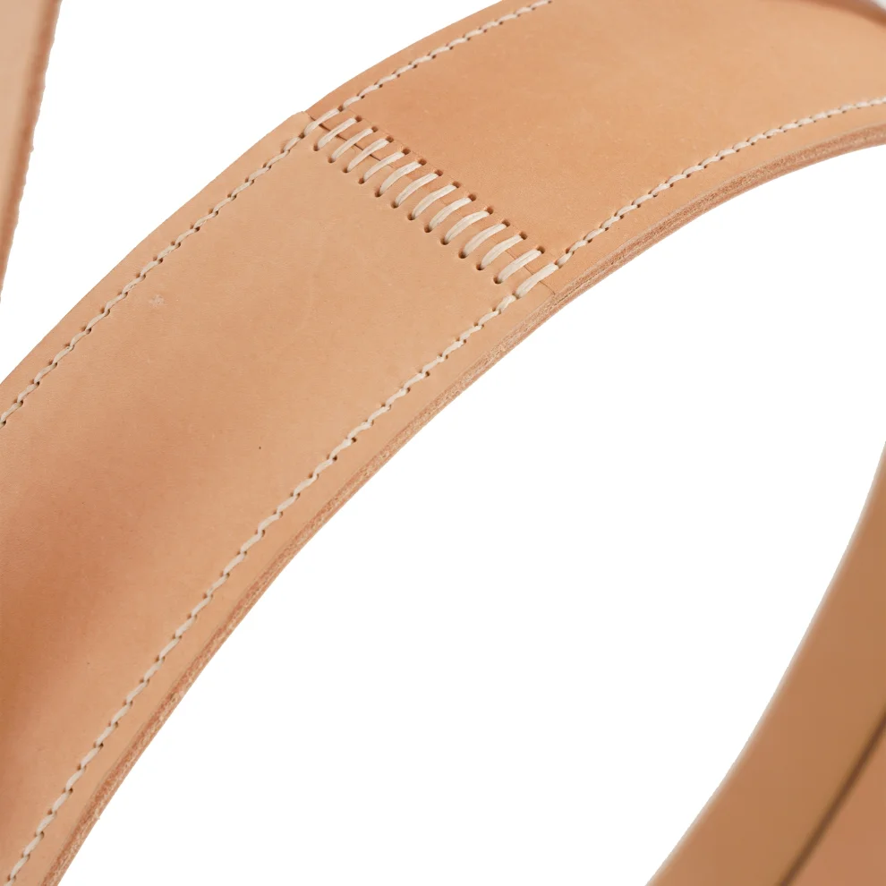 It is handmade by a single craftsman from top quality vegetable tanned leather, 3.5-4 mm thick. Hand stitched. The buckles and hanging apparatus are solid brass.