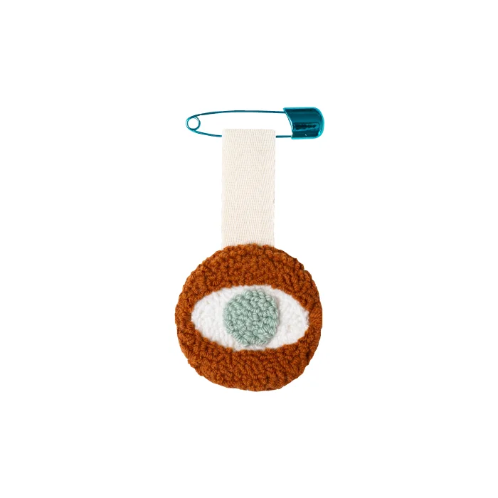 Medallion with a diameter of 5.5 cm, consisting of a velvet hanger and a safety pin in matching colors, produced with the punch technique.