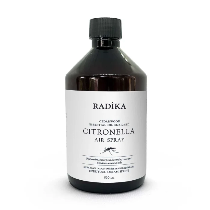 Essential oils of citronella, lemongrass, cedar, eucalyptus, peppermint, clove, thyme and cinnamon. Vinegar with lavender and geranium hydrolates.