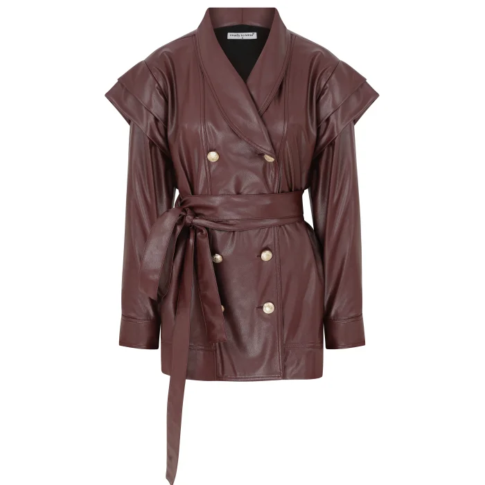 SHOULDER DETAILED WAIST TIE VEGAN LEATHER JACKET