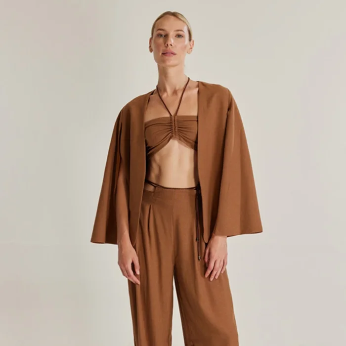 The Srikata Jacket is a stylish piece with a cape-like cut. It is crafted from elegant linen fabric and comes with a lining. The Srikata Jacket is a perfect choice for those seeking both comfort and style. With its unique design and high-quality fabric, the Srikata Jacket complements your overall look and can be worn throughout the seasons.