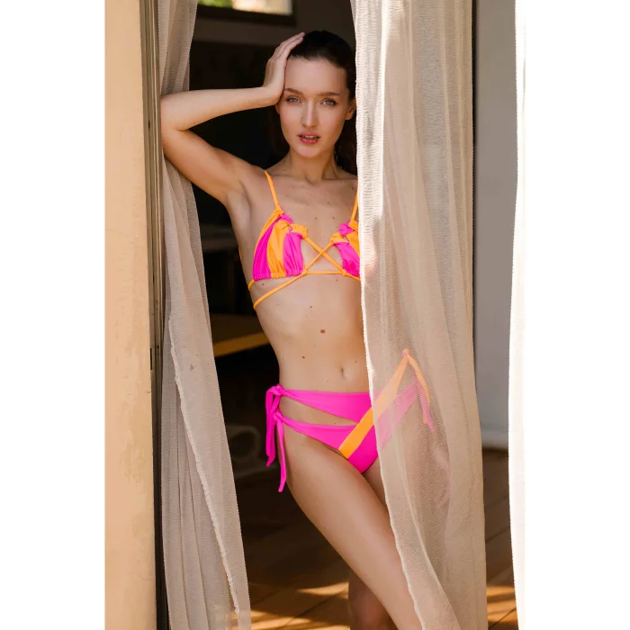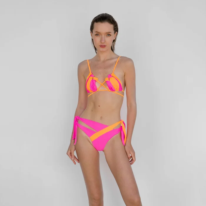 Orange and pink color blocked , On the upper body, she wore a Dara XS size with twist details in contrasting color . Model dimensions: Bust: 80.5cm Waist: 60cm Hips: 89 cm Height: 177cm. 80% Polyamide 20% Elastane