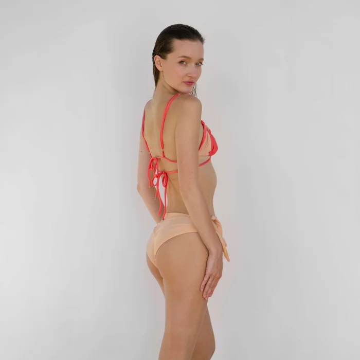 Salmon-toned color-blocked, She wore a Dara XS size with a contrasting twist detail on her upper body . Model dimensions:  Bust: 80.5cm Waist: 60cm Hips: 89 cm Height: 177cm. 80% Polyamide 20% Elastane