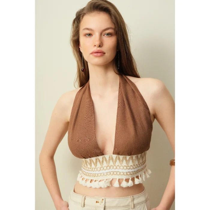 Waist Tassel Detailed 100% Linen Crop Top 100% Linen SIZE:1.72 BODY SIZE: 84/60/88 SIZE OF THE PRODUCTS WORN BY THE MODEL: S/60