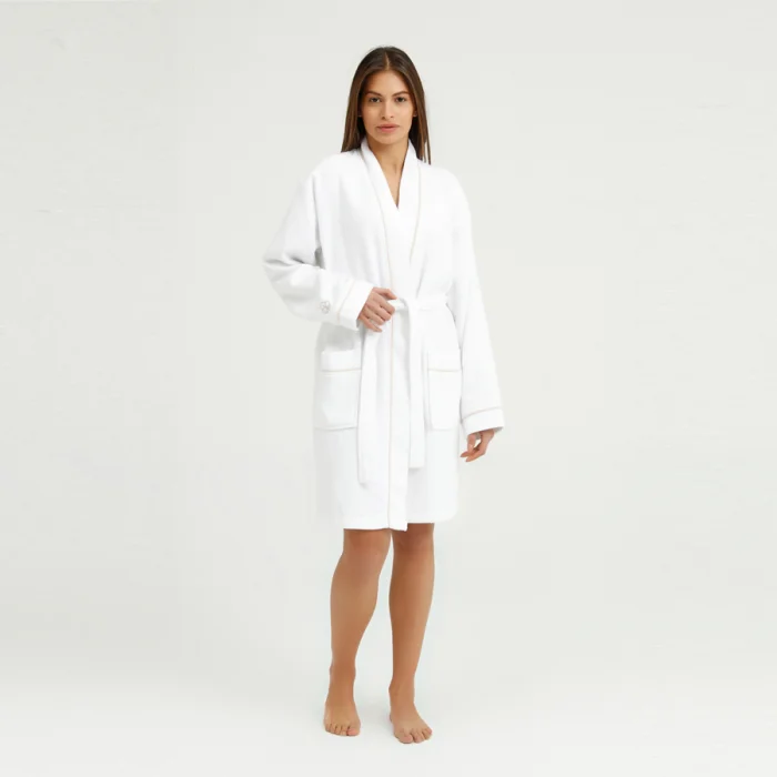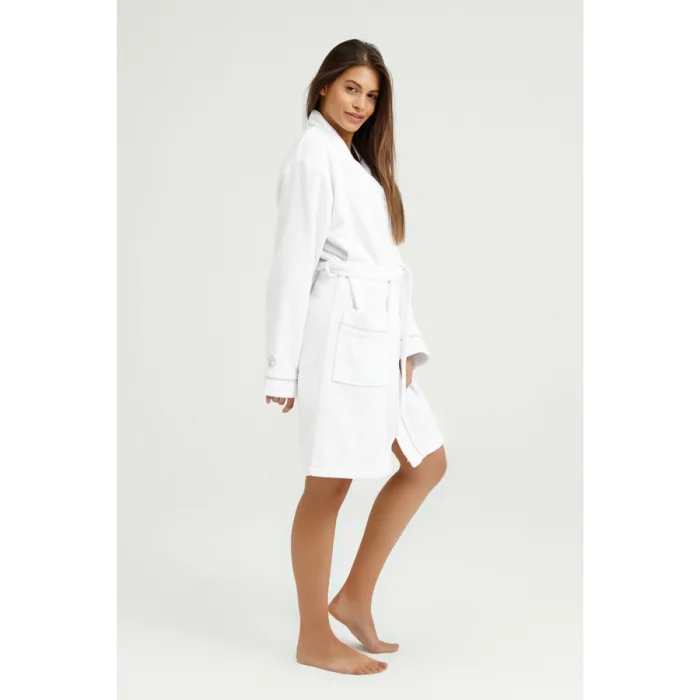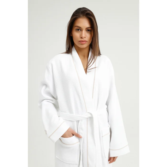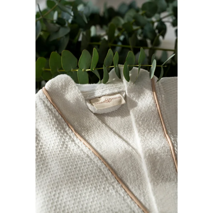 Produced from 100% Aegean Cotton. Our products are Oeko Tex certified. The cotton terry cloth, combined with the waffle texture, provides rapid absorption of water and is attractive with its lightness. In addition to the bathrobe, you can also use it as a dressing gown. In its design, beige bias tape consisting of special threads is used on the collar edges, pocket edges and arm cuffs. On the sleeve cuff, simple and sophisticated elegance is given with embroidery in the same color.