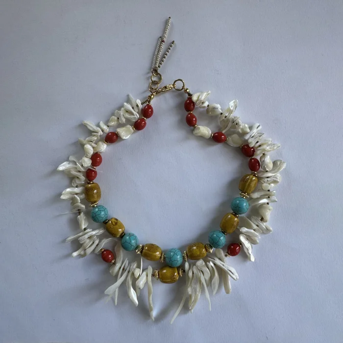 This one-of-a-kind necklace has been carefully designed with ceramic beads, seashells, sand beads, and gold-plated intermediates. Gold plating is also used in the clasps and metal details that complete its elegance.
