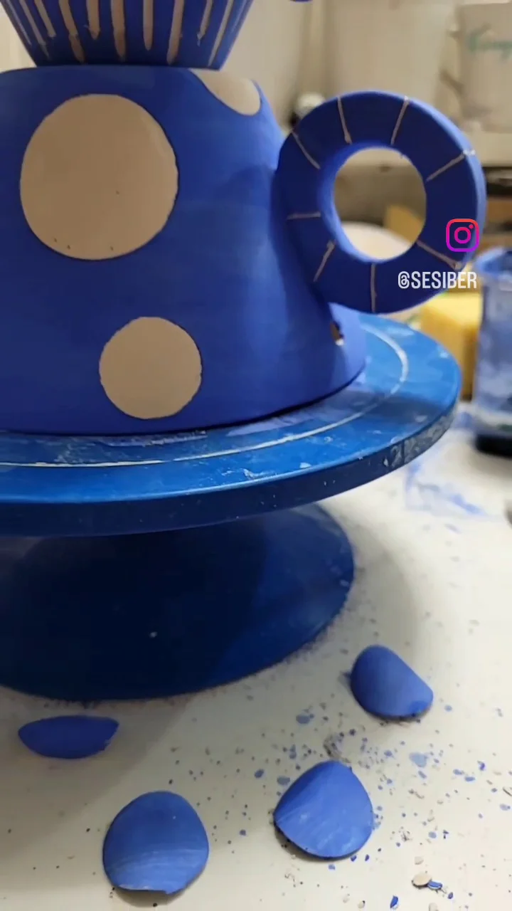 Teapot-, cup shaped, dots and stripes on blue, handmade and hand-painted, ceramic table, bedside lamp, decorative lighting object.