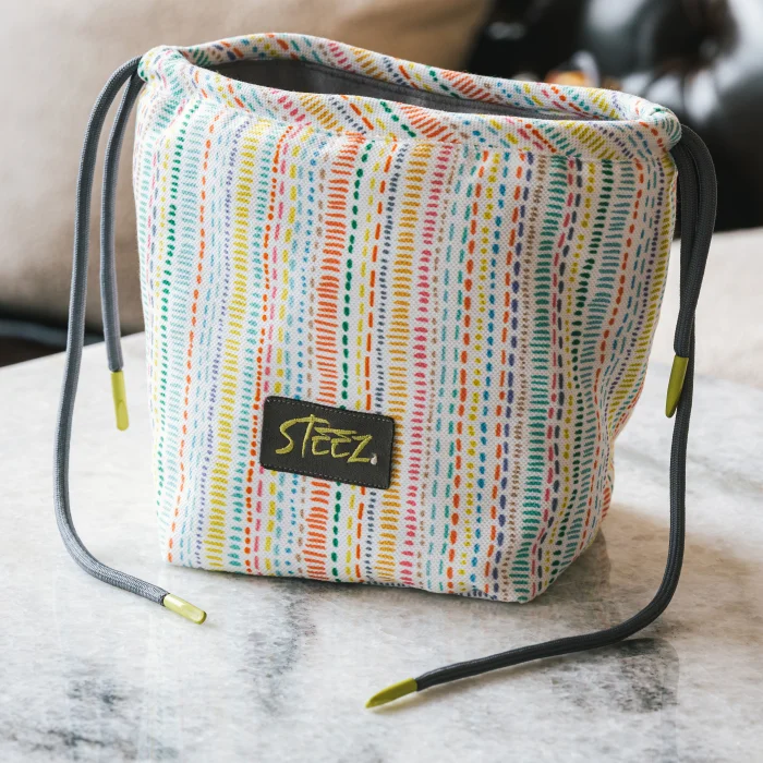 Our bag, with dimensions of 15 x 15 x 21 cm, features two zippered compartments and two elastic pockets for your smaller items that you don't want to get mixed up.