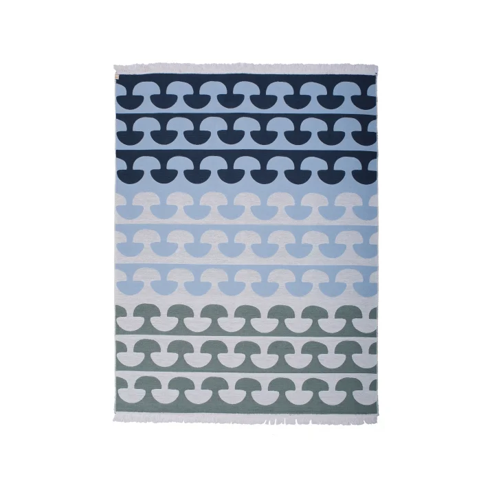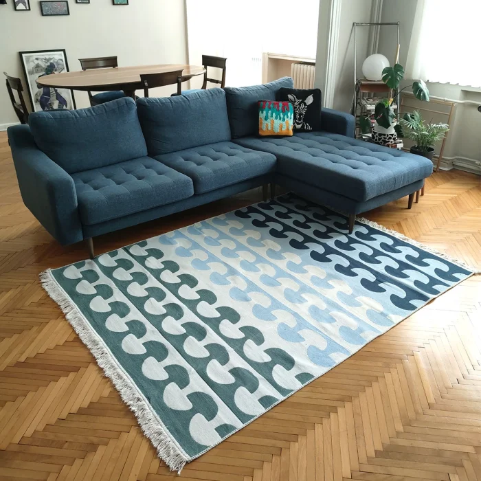 This kilim is designed by Studio Potato and made with recycled cotton fiber. Made on a looming machine, it's woven more tightly compared to hand made kilims and you can use it indoors or outdoors. You can use it with its 2 different sides.