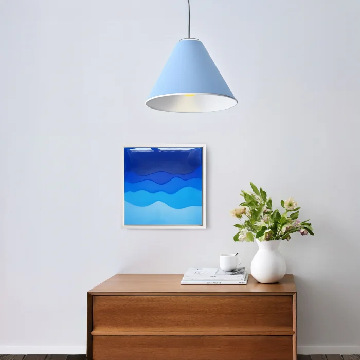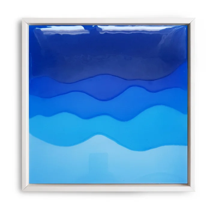 It was created by applying acrylic paint and epoxy on a 30x30cm wooden panel. It consists of 6 separate epoxy layers with a texture similar to the glass surface. The layers are not wooden.