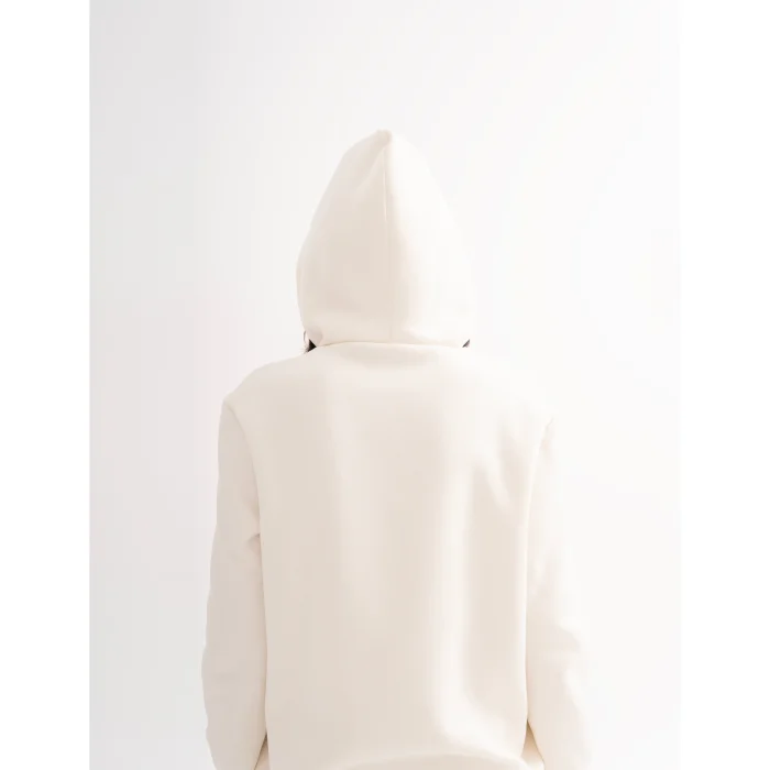 Collar and inner pocket detail, under hip length, oversized hoody.