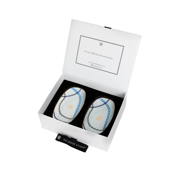 It is sold in 2 pieces. The contents of the box are 2 kayak plates. Length: 21 cm. Fine porcelain of the highest quality is combined with state-of-the-art printing techniques. Our patterns are hand drawings. Our designs are decorated with real gold. It will be sent with the velvet-covered protected box in the image.