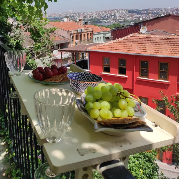 The balcony table, which is hung on the flat balcony iron, can stand in balance within itself, it is fixed with the help of the rope inside the product.