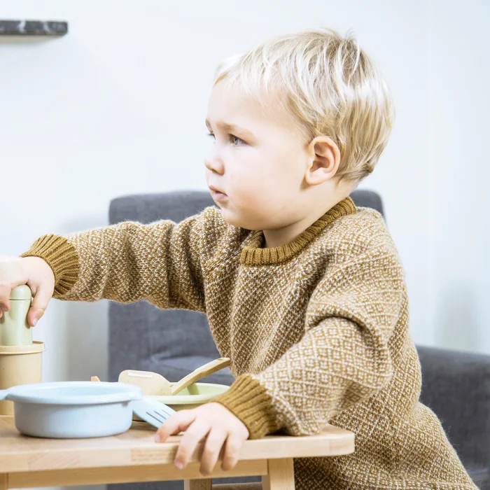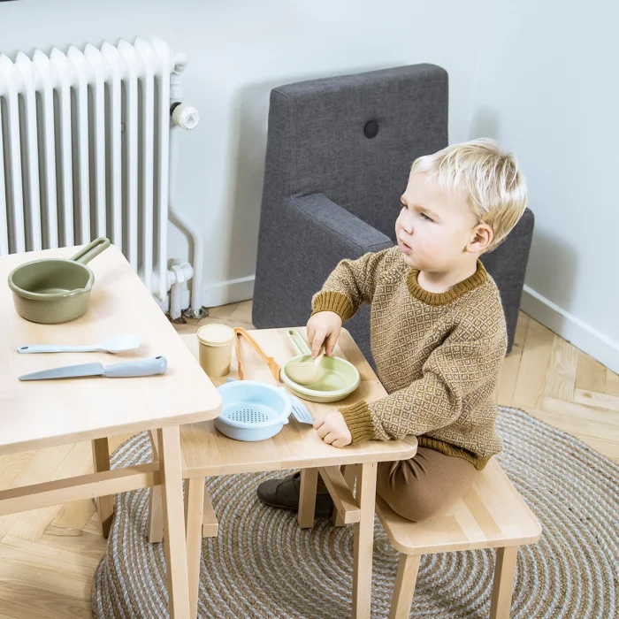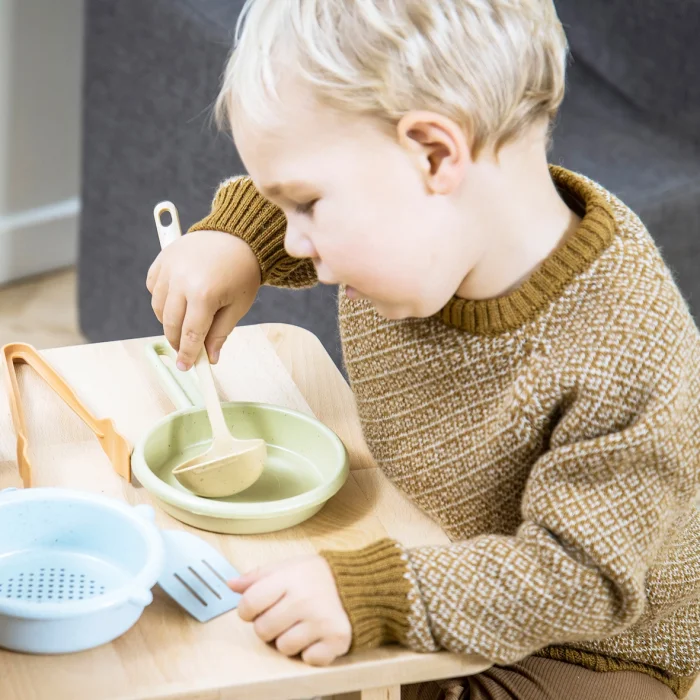 The kitchen set is a Danish-produced bioplastic toy from dantoy that is made from sugar cane, thereby making the product 100% recyclable, 100% sustainable raw material.