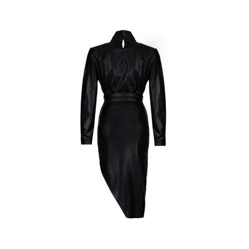Wide-cut blouse with padded shoulders and drawstring details, turtleneck. Asymmetrical leather skirt with a side zip and a drawstring on one side. It is sold as a set.