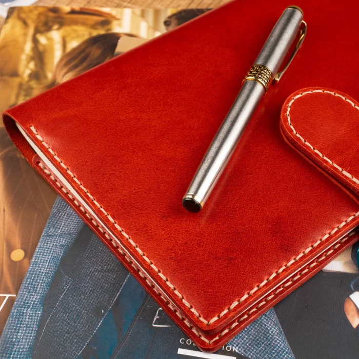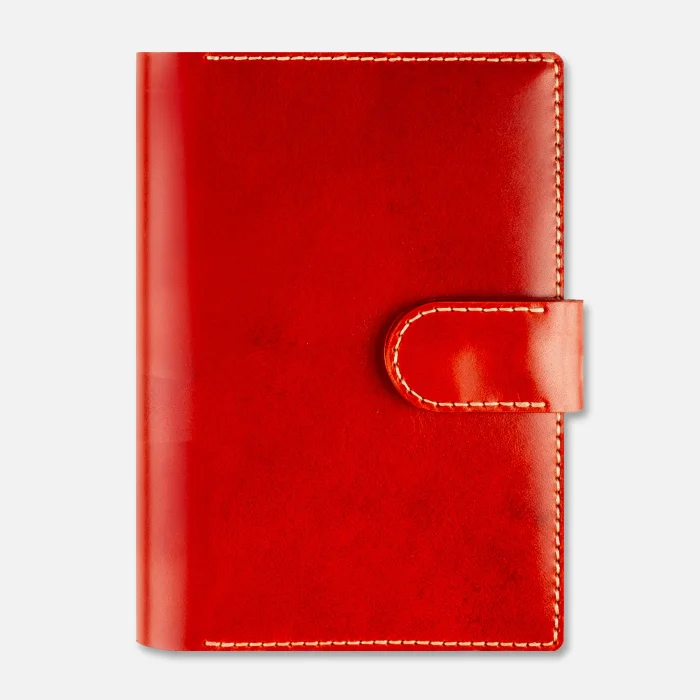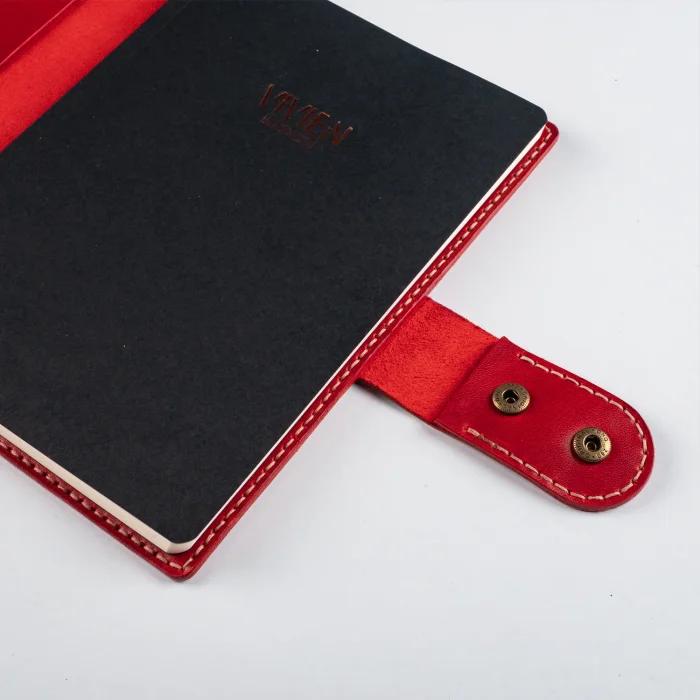 A5 Leather Notebook Cover Inside theproduct; Materials such as Notebooks, Pens, Cards, Note Paper can be placed.Product features;There are card slots in both compartments of the sleeve. It is in standard sizes for A5 notebooks and agendas. Closed dimensions: 17cm x 23.5cm Since our products are completely handmade and due to the nature of the leathers, they may contain slight differences from the visual. It has a special compartment for placing pens. It is made entirely by Hand Sewing.Made of premium quality calfskin.
