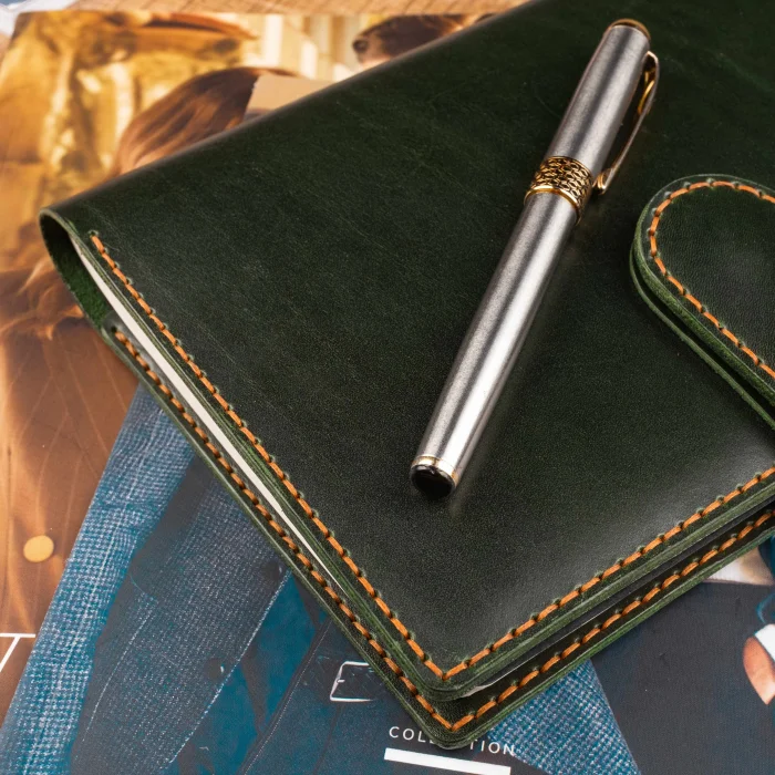 A5 Leather Notebook Cover Inside theproduct; Materials such as Notebooks, Pens, Cards, Note Paper can be placed.Product features;There are card slots in both compartments of the sleeve. It is in standard sizes for A5 notebooks and agendas. Closed dimensions: 17cm x 23.5cm Since our products are completely handmade and due to the nature of the leathers, they may contain slight differences from the visual. It has a special compartment for placing pens. It is made entirely by Hand Sewing.Made of premium quality calfskin.