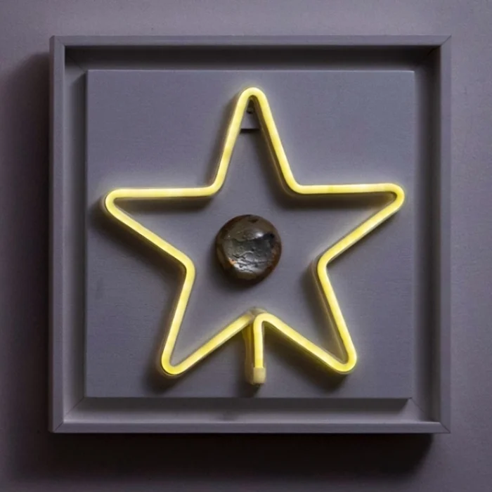 Product Details: There is 1 Wallipop Art product with a "star" shape with yellow neon light placed in a white color frame with a depth of 35 x 35 cm. Size: 35 x 35 cm (frame) Product Colors: White frame, yellow neon light, Wallipop Art hemisphere Method of Application: It is applied to the wall with the apparatus behind the frame. There is a nail eye on the back of the frame so that it can be hung on the wall. The LED light can be used by attaching 3 AA size batteries to the battery box behind the frame. After being opened with the on-off device on the battery box, it can be opened and closed when desired by pressing the button at the bottom of the frame. It is suitable for use wherever you need it, without the need for an electrical outlet. Apart from being used with 3 AA size batteries, when requested, the USB cable can be plugged into the socket adapter with a USB input, and it also works with a socket. Input voltage: 4.5V Luminous flux: 7 LM The part in cloud form with the light on is seen as a white LED when the light is off. Delivery Time to Cargo: 7 working days