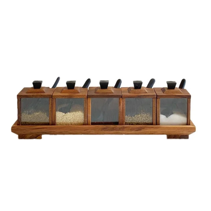 The hidden heroes of the tables With the Bahamian walnut spice rack (5 pcs), you can ensure that the spices that are always necessary in your kitchen are easily accessible at hand. It can also be a permanent accompaniment to your table. Solid products have texture differences within themselves, so different textures and appearances are natural for each product. Since all of the products are produced by hand, millimetric differences can be observed in dimensions due to differences in blade allowances and coating thicknesses.