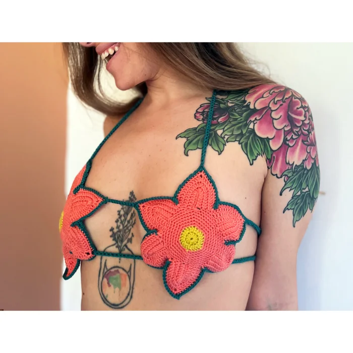 It should be tied at the back and neck and is adjustable. You can choose the size according to your breast size and preferred posture. You can choose a large size for a more closed posture. It is suitable for swimming, but for longer use, we recommend that you dress while sunbathing, not while swimming. The model's size is XS and its height is 162 cm Shot with XS-S size. Material: 100% Microfiber Acrylic Rope